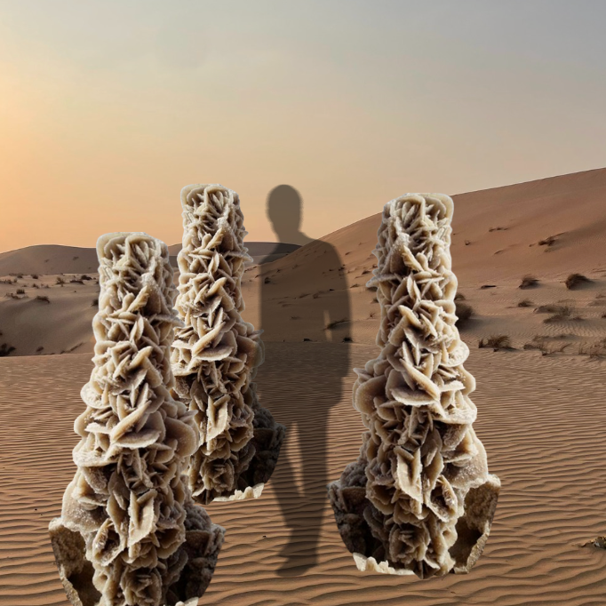 The Desert Rose Installation will consist of three large desert rose sculptures, each approximately human height, arranged in a triangular configuration to surround the participant. Each sculpture will integrate embedded speakers, motion sensors, distance sensors, and Neopixel LED strips, enabling synchronized audiovisual interaction that reacts dynamically to user behavior and proximity.