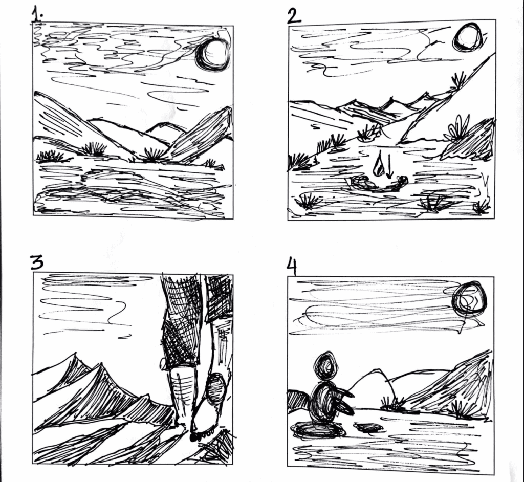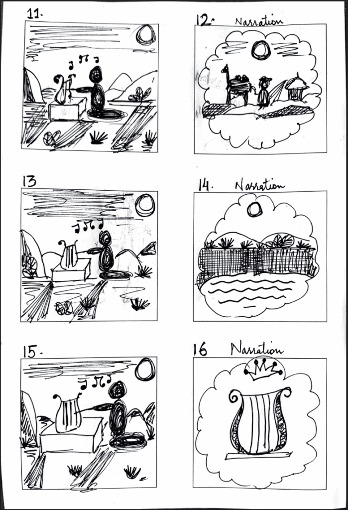 We cut back to the desert. A lyre is partially visible, with a dune covering its lower half. This is captured from a low angle to give it a sense of mystery and importance.