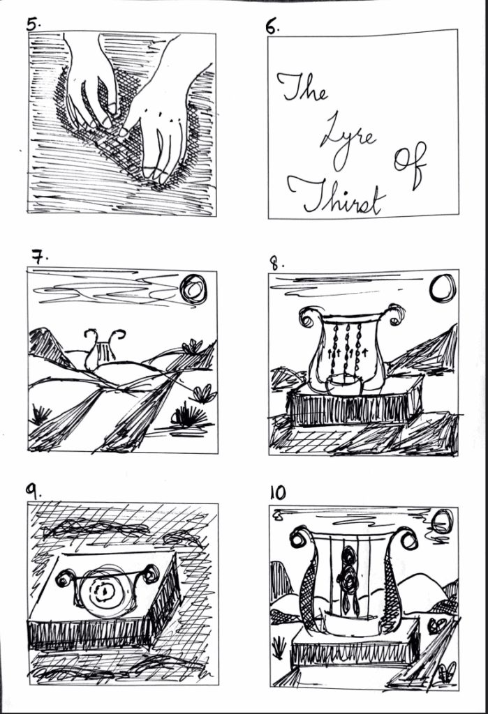 Cut to a black screen with the title “The Lyre of Thirst” written in clean, bold text, simple, stark, and powerful.