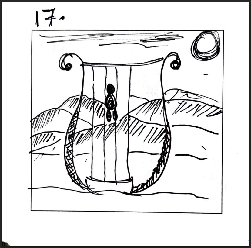 From a top-down perspective, we see water flowing down from the lyre’s strings into a small, bucket-shaped basin below, gently filling up.