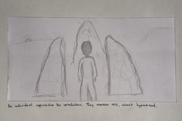 We cut back to the desert. A lyre is partially visible, with a dune covering its lower half. This is captured from a low angle to give it a sense of mystery and importance.