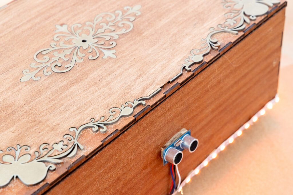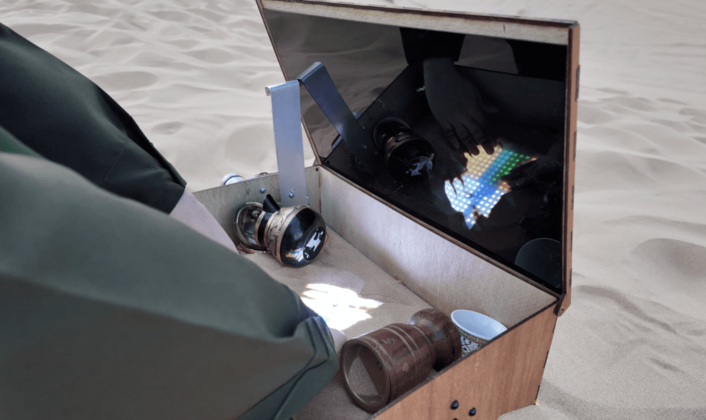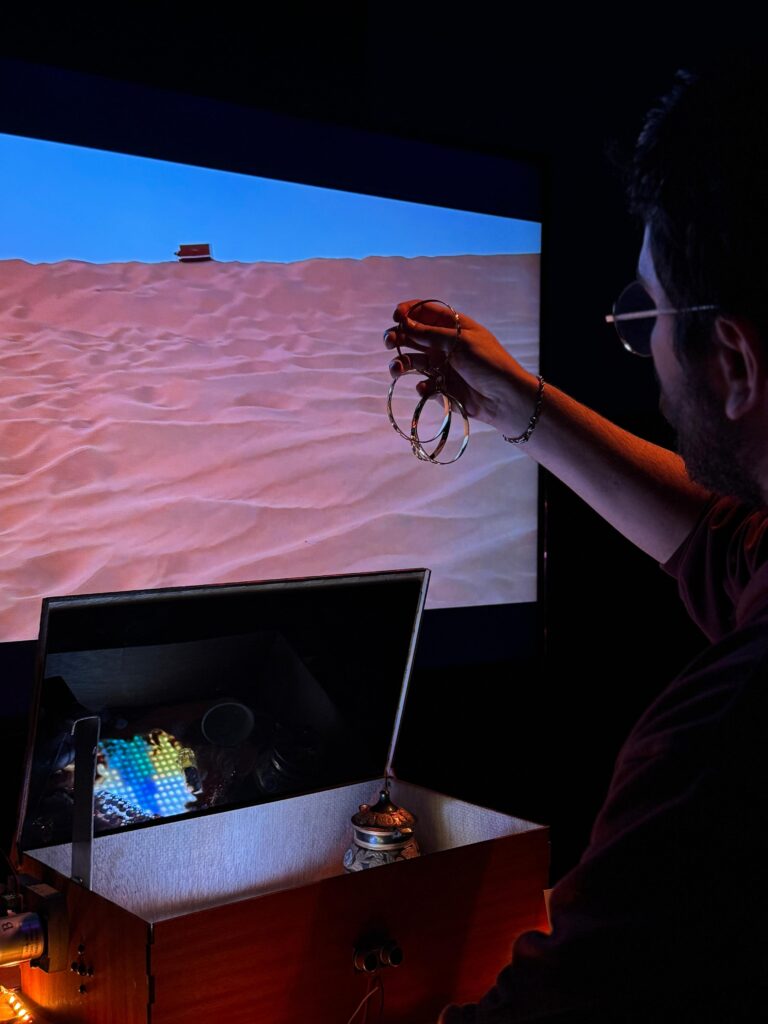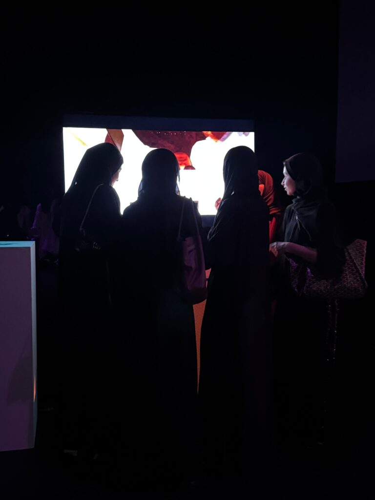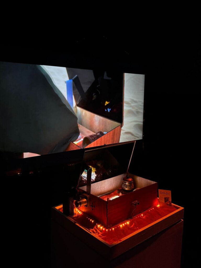 When participants come close, the box gently opens to reveal a layer of cultural objects that speak to memory, tradition, and identity. Beneath a thin layer of sand, a moving image of the Burj Khalifa appears, symbolizing progress rising from the land. This is a glowing scene representing the UAE’s future and its rapid development.