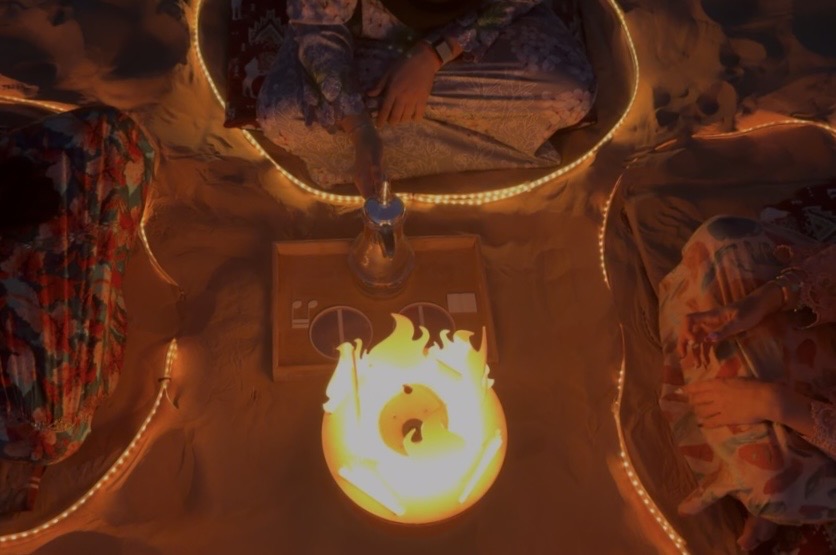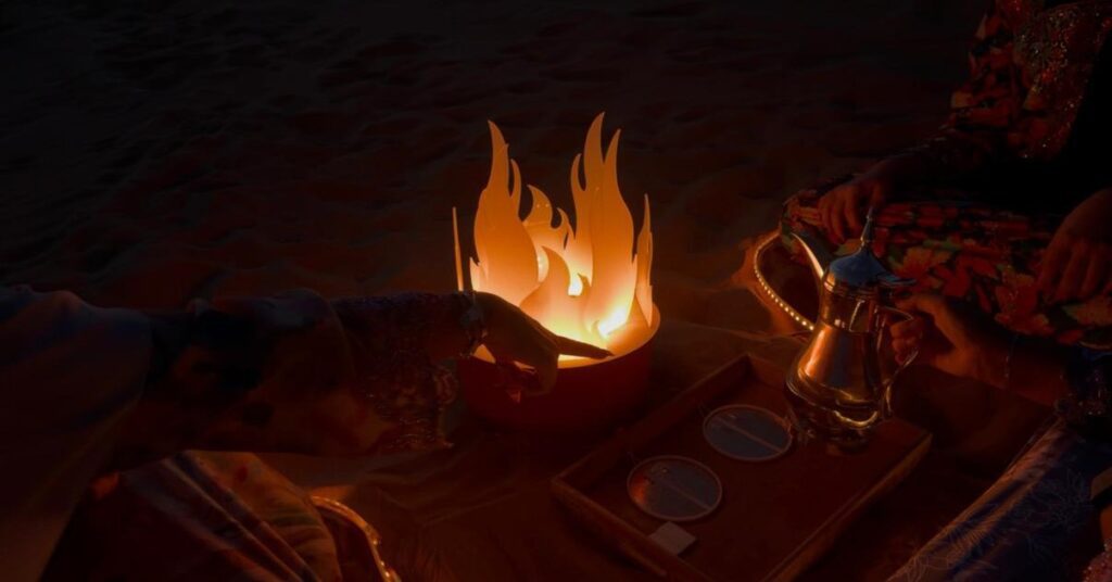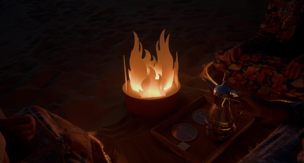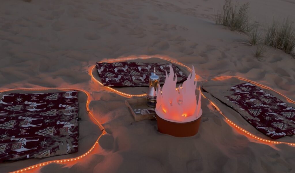 اِقْرَبُّوا Iqrabbu is an installation inspired by Emirati culture and the tradition of welcoming people with warmth and hospitality. The experience begins when visitors take their seats in the space. As each person sits down, the lights around their seat glows, acknowledging their presence. With every new person who joins, the firepit in the center grows brighter, much like gatherings that become richer and more lively as more people come together. Guests are invited to place the dallah (coffee pot) , a symbol of welcome and generosity in Emirati culture, onto one of the plates to choose between listening to traditional music or story.